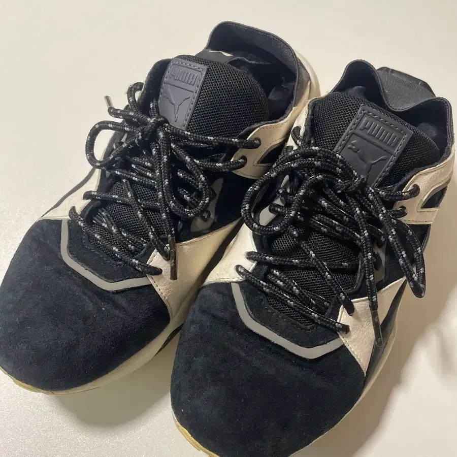 스웨이드와 메쉬의 콤비네이션으로, 스타일리시한 디자인의 스니커즈. - 브랜드: Puma - 색상: 블랙/화이트 - 소재: 스웨이드/메쉬 - 밑창 상태: 사용감 있음 - 디자인: 로우컷 방문해 주셔서 감사합니다. 사이즈 - 23.5cm BTS와 PUMA의 콜라보 스니커즈입니다. 10년 전쯤 한국에서 구매했으며, 실내에서만 착용했습니다.