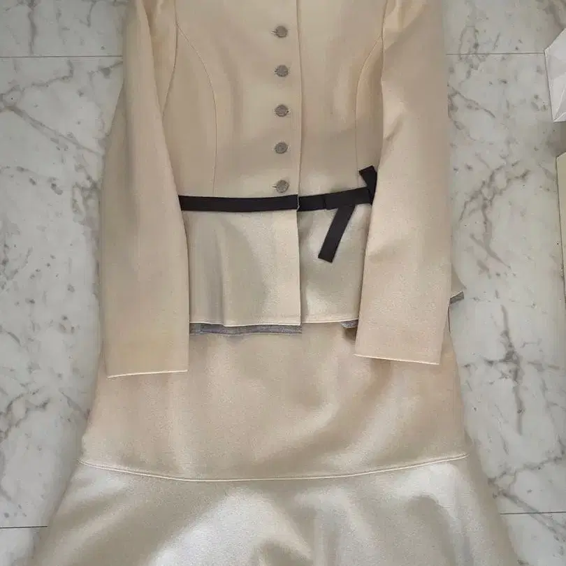 아이보리 자켓과 플레어 스커트 세트. 허리 리본 포함으로 엘레강트합니다. 그레이 테두리가 멋스럽습니다. - 색상: 아이보리 - 스타일: 자켓과 스커트 세트 - 디자인: 버튼이 있는 자켓, 허리 리본 포함 - 스커트 디자인: 플레어 스커트, 밑단에 실버 테두리 - 사이즈: 38 - 모 100% - 샘플 상품으로 택이 손글씨입니다. - 미사용 새상품