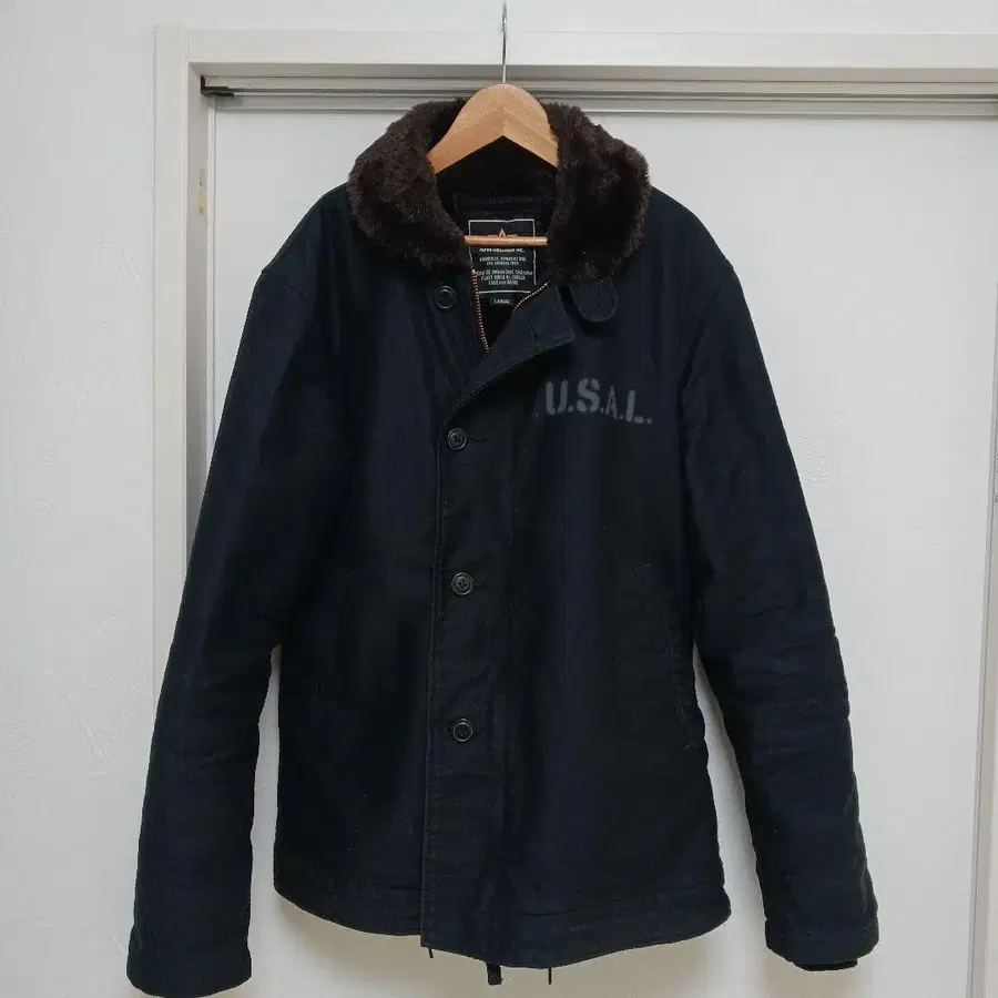 - 색상: 블랙 - 사이즈: LARGE - 특징: 퍼 옷깃 - 로고: U.S.A.L. 방문해 주셔서 감사합니다. 가장 아래쪽 버튼이 없습니다. 컬러 - 블랙 계열
