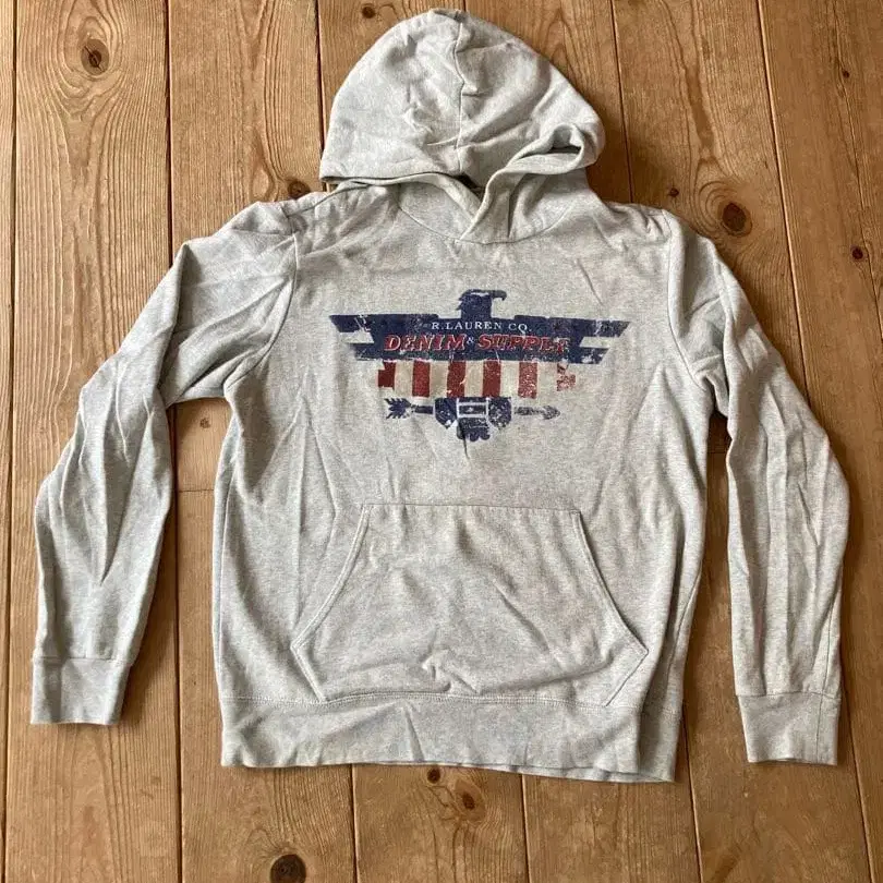 - 브랜드: DENIM & SUPPLY - 색상: 그레이 - 디자인: 프린트 - 후드: 있음 - 포켓: 캥거루 포켓 - 소재: 코튼 혼방 사이즈 M 기장 64cm, 가슴 너비 56cm, 어깨 너비 45cm, 소매 길이 64cm 얇은 소재의 맨투맨입니다. 후드 끈은 원래 없는 상품입니다. 데미지는 없으나, 후드 앞쪽 끝 부분에 자세히 보면 희미한 노란 얼룩이 있습니다 ( 이미지 ⑥ ). 방문해 주셔서 감사합니다. 사이즈 - M