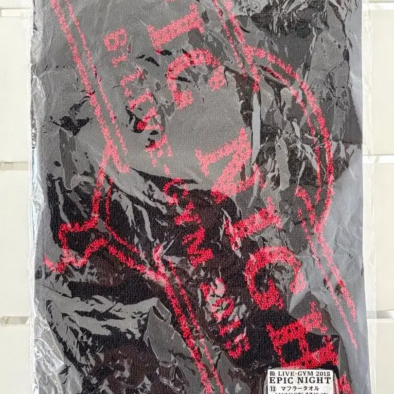 2015년 EPIC NIGHT 라이브용 머플러 타월입니다. 블랙 베이스에 빨간색 글씨 디자인으로, 컬렉션이나 실용적인 용도로 최적입니다.