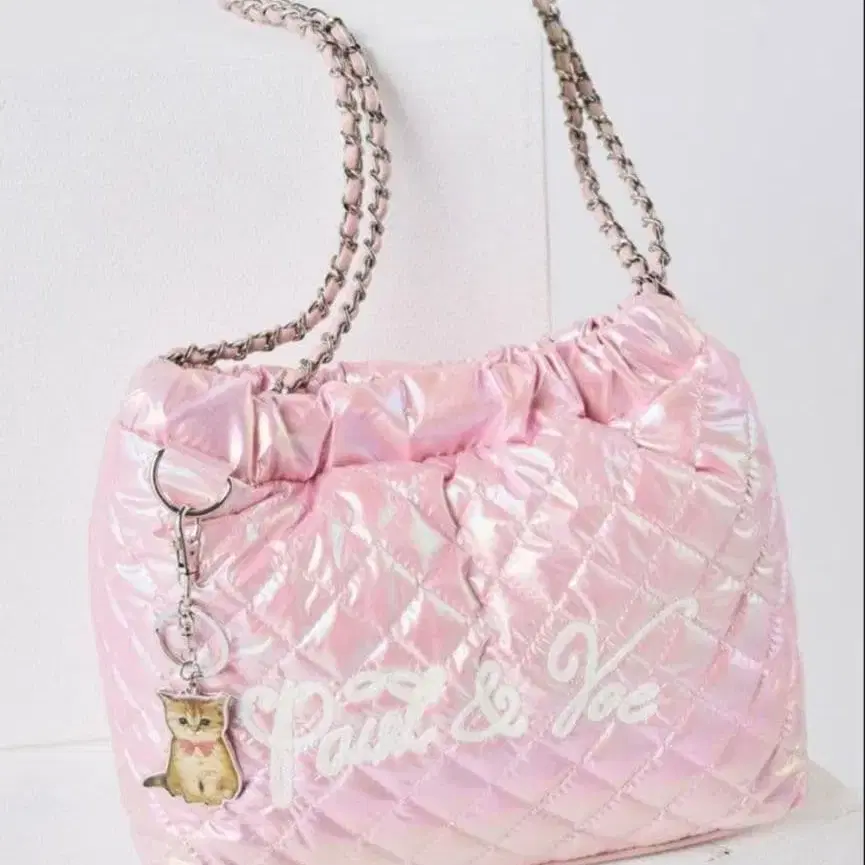 퀼팅 디자인의 핑크 숄더백, 고양이 참 포함.