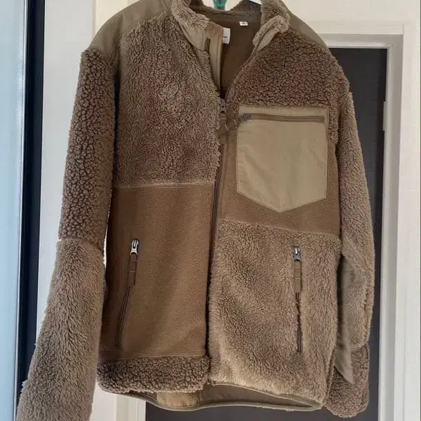 패치워크 디자인의 베이지 플리스 자켓, 지퍼 포켓이 있어 기능성도 갖추고 있습니다.