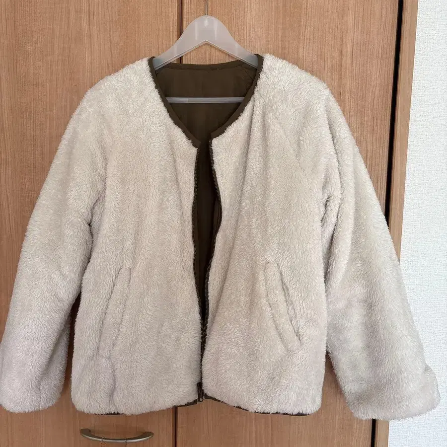 화이트 보아 자켓, 집업 디자인에 사이드 포켓이 있습니다.