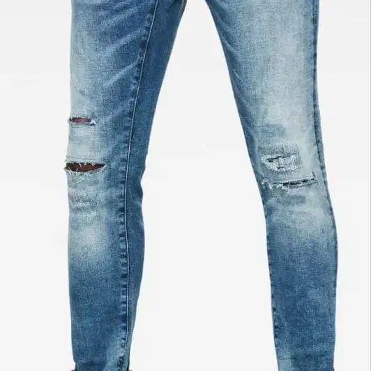 G-Star RAW의 4101 Lancet 모델, 데미지 가공 라이트 블루 스키니 데님.