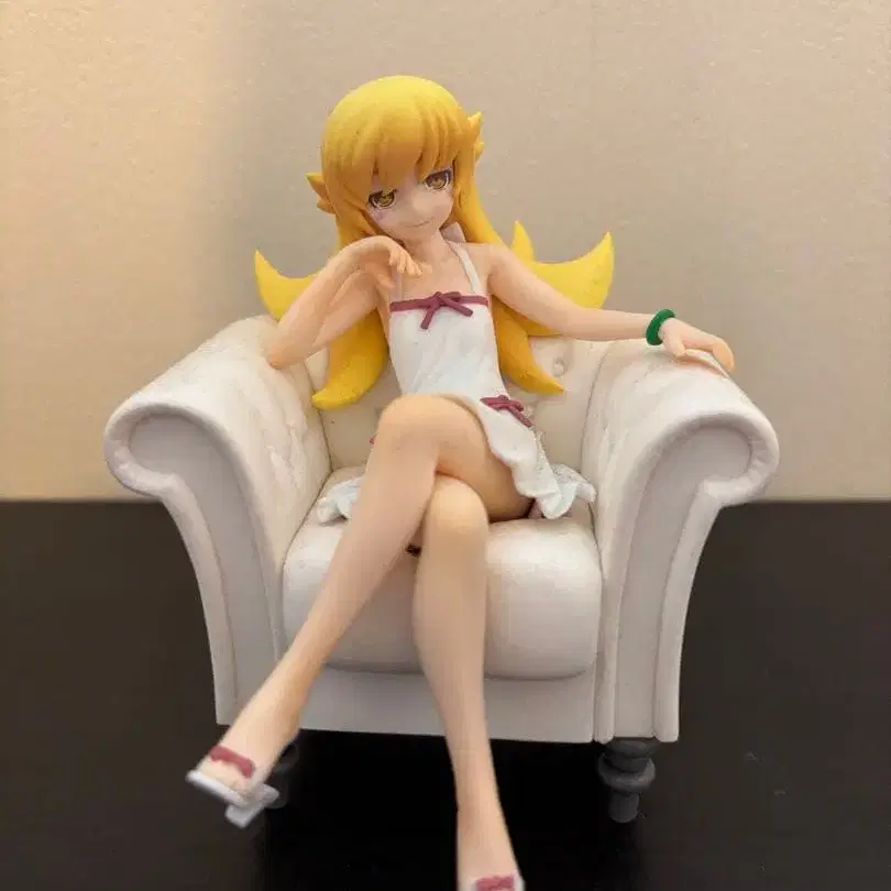 골드 컬러의 머리카락을 가진 여아 피규어, 화이트 드레스와 의자가 특징입니다.