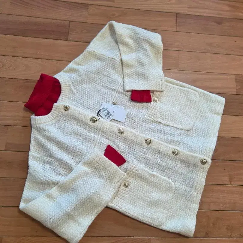 자동 번역되었어요. 원문보기사이즈가 맞지 않아 아쉽지만 판매합니다. 아이보리 가디건, 골드 컬러 버튼이 달린 세련된 디자인입니다.