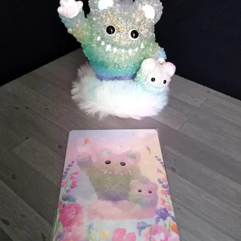 컬러풀하고 투명감 있는 몬스터 피규어, 귀여운 어린이 포함.