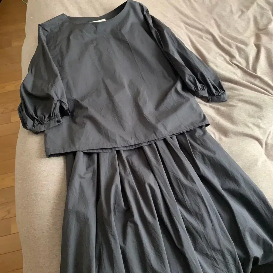 블랙의 B:MING제 상의와 허리밴딩 스커트. 사이즈 허리 38cm 총장 80cm 사이즈 표기는 M이지만 L 사이즈 분도 괜찮을 것 같습니다. 약간의 주름이 있습니다. 코튼 100%