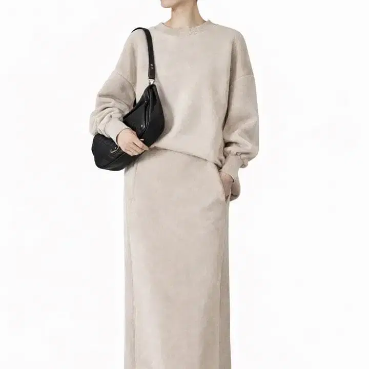 고급스러운 분위기의 페이크 스웨이드 소재로 제작한 풀오버 상의. 심플한 디자인이지만, 센터 백 부분에 리브 라인을 넣어 디자인성을 더했습니다. 같은 소재로 나온 스커트와 셋업 스타일링도 추천합니다.