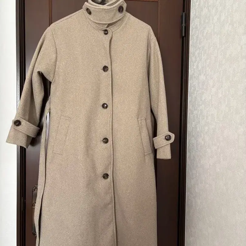 버튼이 달린 베이지 롱 코트, 하이넥 디자인으로 스타일리시합니다. - 색상: 베이지 - 디자인: 버튼 포함, 하이넥 - 스타일: 롱 코트 - 특징: 허리 벨트 포함 - 버튼 색상: 다크 브라운 방문해 주셔서 감사합니다. 색상 - 베이지 계열 얼룩, 찢김, 냄새 등 - 없음