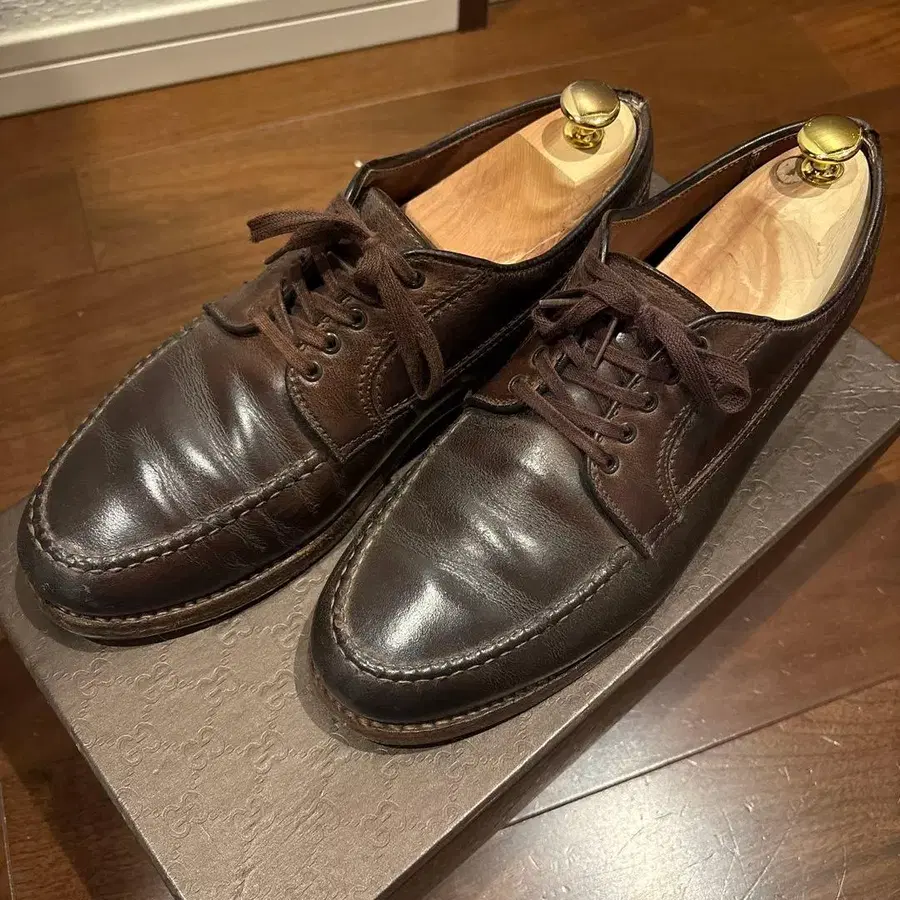 알든의 레인저 모카신입니다. 최근에는 상당히 레어해져서, 매니아분들이 많이 찾으시는 일품입니다. 코도반은 아니지만, 다크 브라운 색상의 에이징이 진행되어 상당히 좋은 분위기를 내고 있습니다! 상태는 약간의 주름 부분에 갈라짐 등이 있지만, 오일을 넣었기 때문에 찢어짐 등은 없습니다. 연대물이므로 고려 부탁드립니다! 사이즈는 8.5 E 와이드입니다.