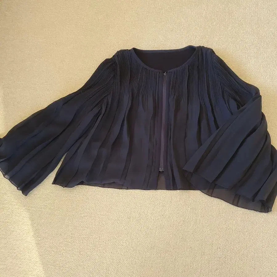 네이비 색상의 리버서블 블루종입니다. 쉬폰 플리츠 디자인의 노카라 자켓으로, 플레어 슬리브와 지퍼 개폐가 특징입니다. 반대면은 스트레치가 잘 되는 저리 소재로, 심플한 디자인이지만 소매와 밑단에서 플리츠가 살짝 보여 매우 사랑스럽습니다. 심플한 원피스와 함께 입어도 좋고, 캐주얼하게 겉옷으로 걸쳐 입어도 멋스럽습니다. 스트레치가 잘 되어 착용감이 좋습니다. 세탁이 가능한 점도 장점입니다. 마음에 들었지만, 사이즈가 맞지 않아 내놓습니다. - 색상: 네이비 - 디자인: 플리츠 디자인 - 소매: 플레어 슬리브 - 개폐: 지퍼 - 소재: 쉬폰 방문해 주셔서 감사합니다. 어깨 너비/가슴 너비/소매 길이/기장 어깨 너비 - 34cm 가슴 너비 - 46cm 소매 길이 - 48cm 기장 - 44cm 색상 - 네이비 계열 계절감 - 봄, 가을 얼룩, 찢김, 냄새 등 - 없음