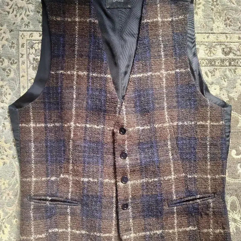 울 혼방 체크 무늬 수트 베스트, 새틴 안감으로 고급스러움. - 브랜드: TAGLIATORE - 디자인: 체크 무늬 - 색상: 브라운 계열 체크 무늬 - 소재: 울 혼방 - 안감: 새틴 마감 - 특징: 백 벨트 포함 어깨 너비/가슴 너비/소매 길이/기장 어깨 너비 - 31cm 가슴 너비 - 49cm 기장 - 55cm 다른 사이트에도 판매 중이므로 구매 전 반드시 댓글 남겨주세요.