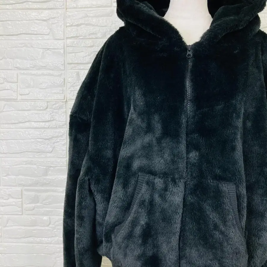 • 후드 부착 블랙 인조 모피 자켓