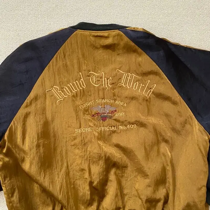 새틴 소재의 골드 컬러와 블랙 봄버 자켓, 뒷면에 자수가 놓여 있습니다. - 디자인: 골드 컬러와 블랙 배색, 뒷면에 자수 있음 - 스타일: 봄버 자켓 스타일 - 소재: 새틴 소재 - 특징: 지퍼 있음, 리브 니트 소매와 밑단 방문해 주셔서 감사합니다. 사이즈 - FREE SIZE #빈티지 #스카잔