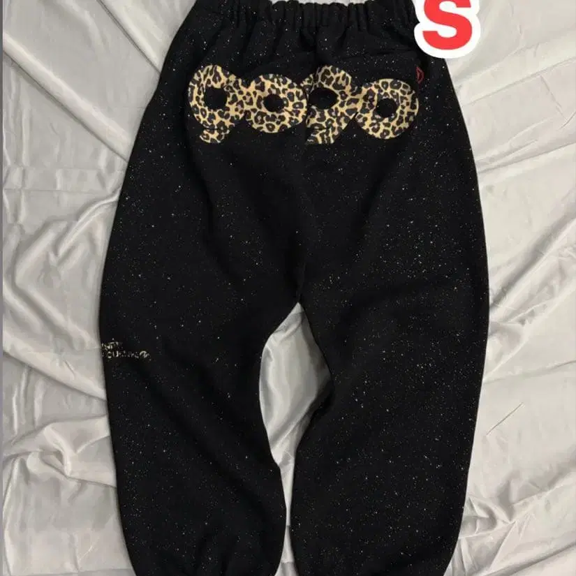 레오파드 무늬 장식이 특징인 스웨트 팬츠, 스팽글 같은 무늬가 매력적입니다. - 색상: 블랙 - 디자인: 레오파드 무늬 장식 - 사이즈: S - 소재: 맨투맨 소재 - 특징: 스팽글 같은 무늬