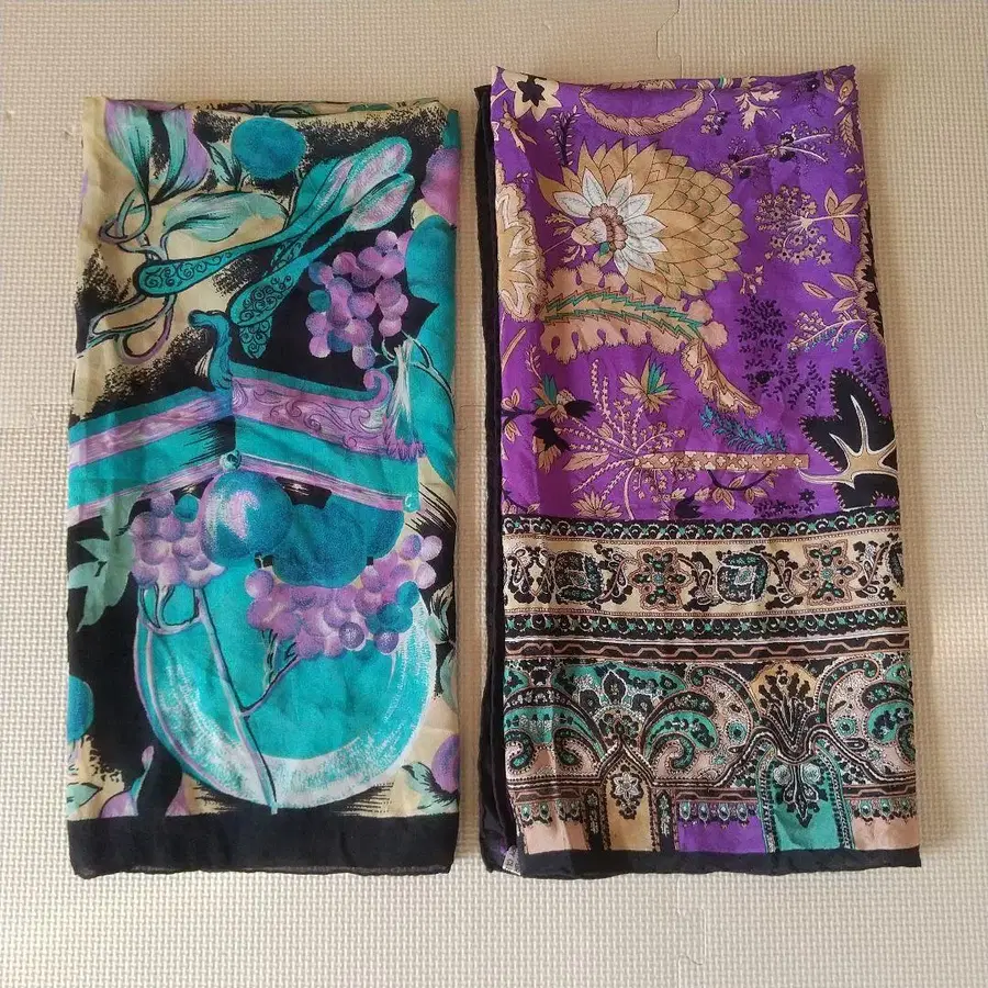 다채로운 꽃무늬와 기하학 패턴이 특징인 스카프.