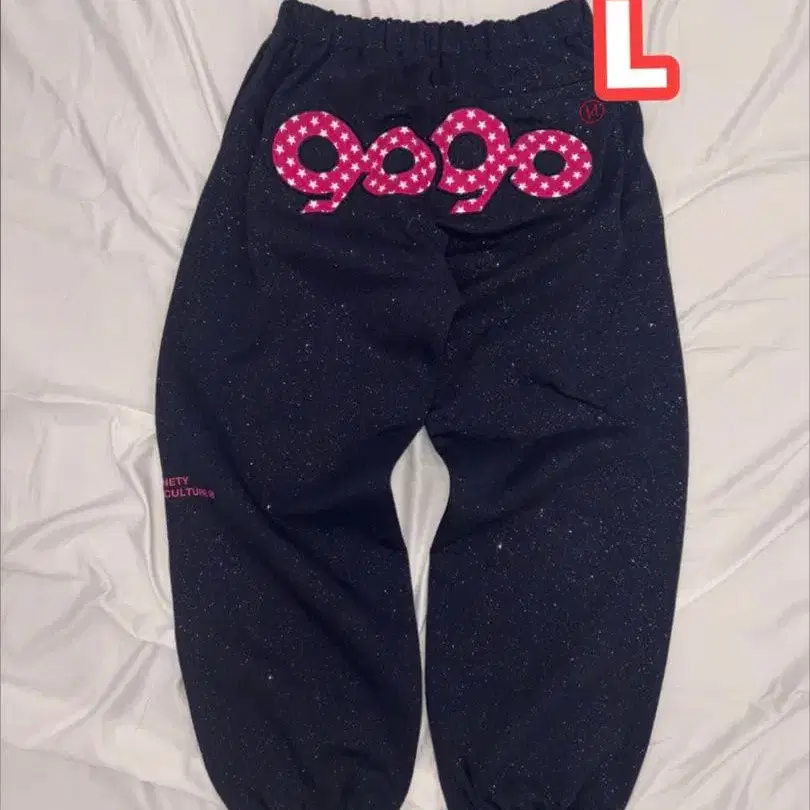 도트 무늬 로고 프린트가 특징인 네이비 조거 팬츠, L 사이즈, 허리와 밑단이 밴딩 사양으로 쾌적한 착용감. - 색상: 네이비 - 사이즈: L - 디자인: 도트 무늬 로고 프린트 - 특징: 허리밴딩, 밑단 밴딩