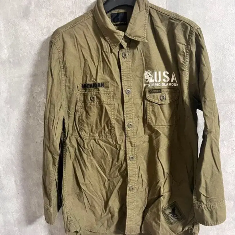 올리브 색상의 캐주얼 셔츠, USA 프린트와 포켓 부착. - 색상: 올리브 - 디자인: USA 프린트 부착 - 스타일: 캐주얼 - 소재: 코튼 혼합 - 특징: 포켓 부착 방문해 주셔서 감사합니다.