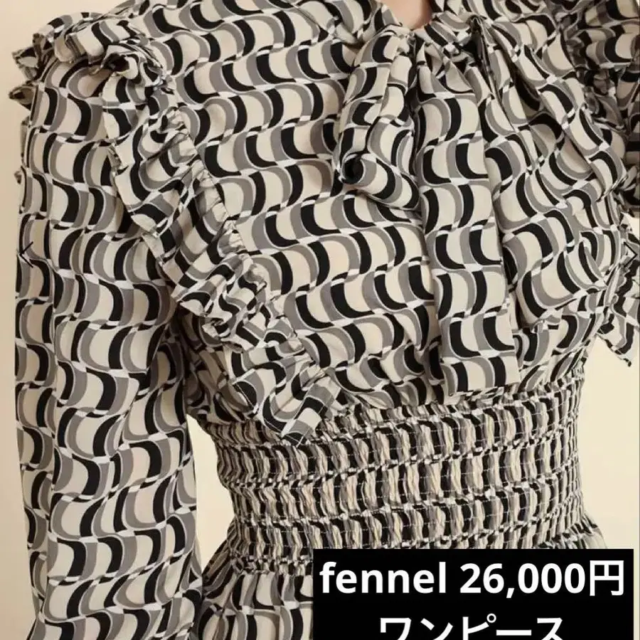 모던한 기하학 패턴이 엘레강트한 인상을 주면서, 가슴 부분의 리본과 숄더 프릴이 화려하고 성숙한 페미닌한 분위기를 연출합니다.