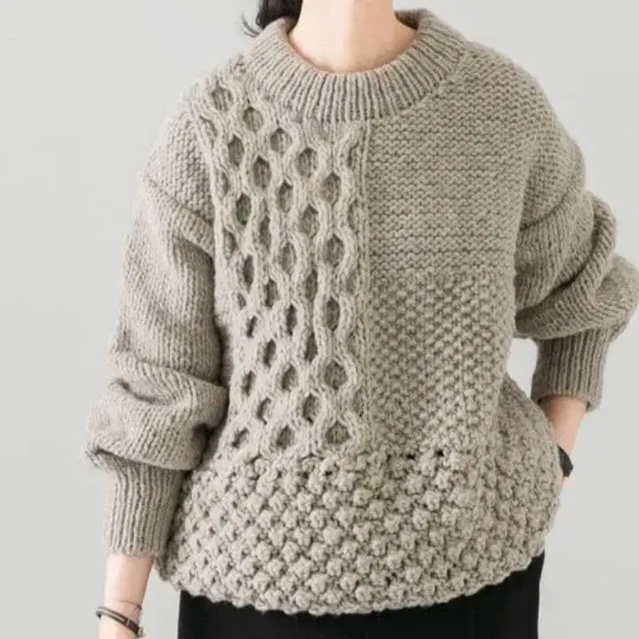 ✤ 아란 패턴을 활용한 패치워크 디자인의 크루 니트입니다. 다양한 니트 직물을 조합하여 입체감 있는 표정으로 완성되었으며,