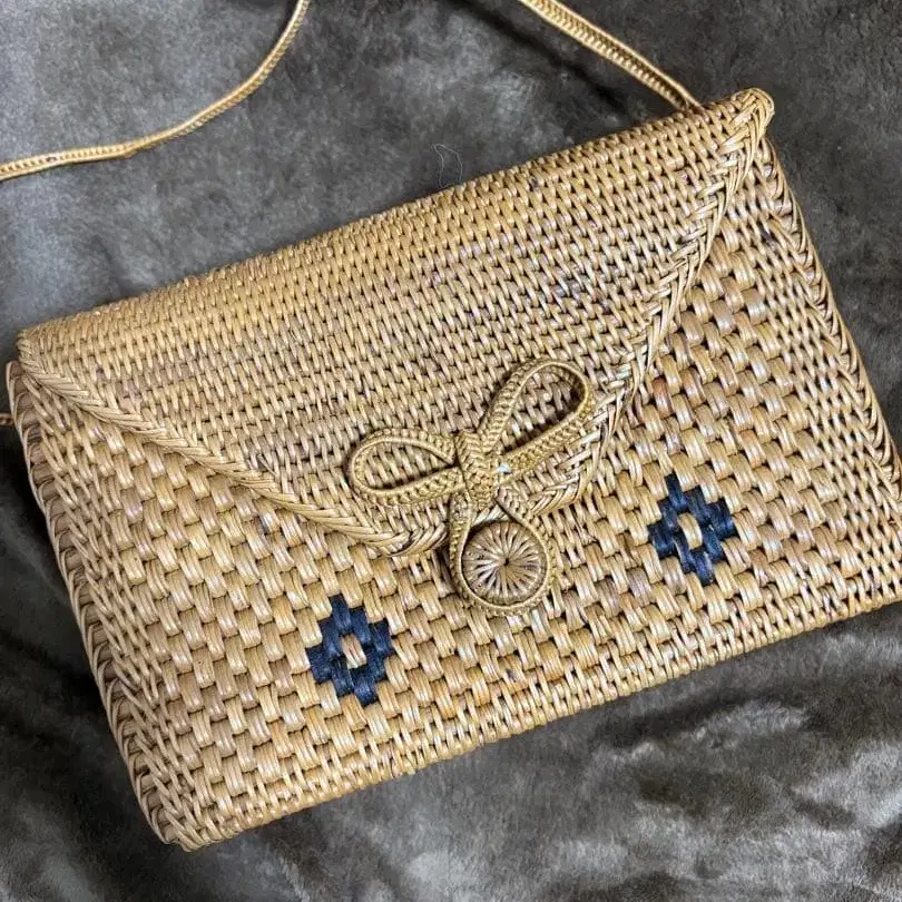 뜨개질 디자인의 베이지 바스켓백, 파란색 무늬 포함.