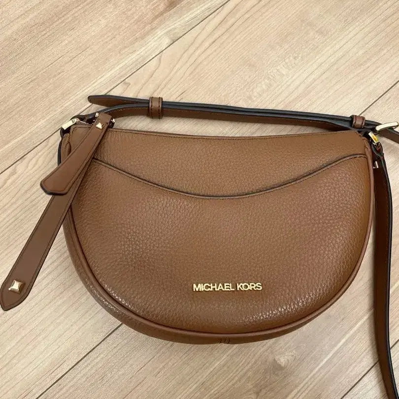 브라운 색상의 가죽 하프문 숄더백, 내부에 슬리브 포켓이 있습니다.