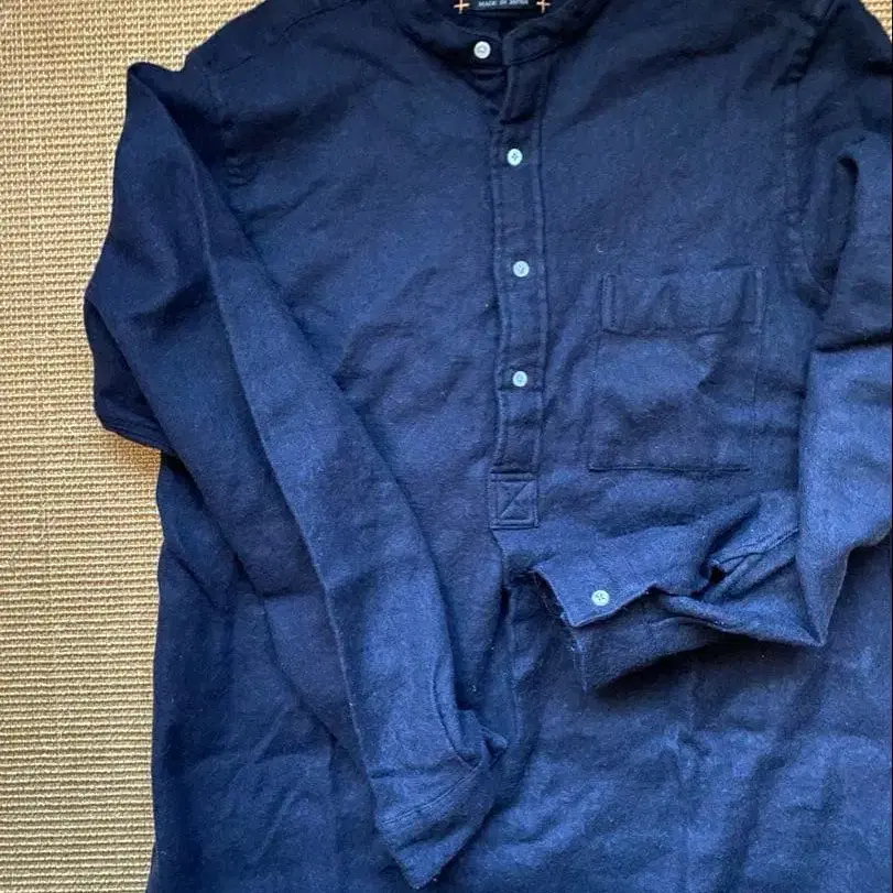 밴드 카라의 풀오버 플란넬 셔츠. 군복 같은 분위기와 터프한 소재감으로, 매우 멋스럽습니다. 컬러 네이비 사이즈 L 생산 일본 소재 울 47%. 린넨 53%