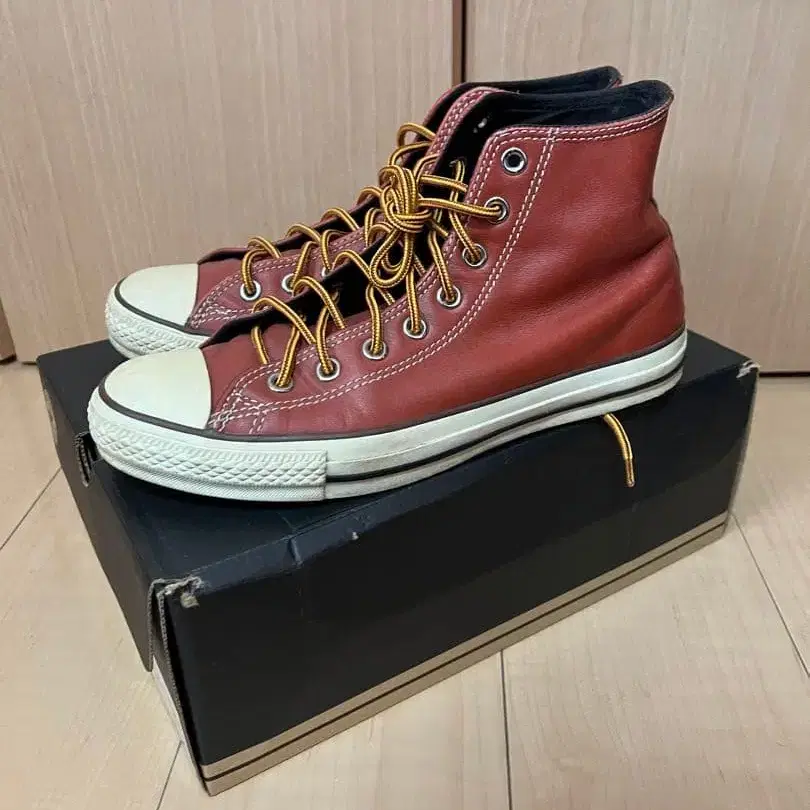 CONVERSE ALLSTAR WORKBOOTS HI입니다. 중고로 구매했습니다. 1950년대에 출시된 워크 부츠를 모티브로 한 제품입니다. 어퍼는 오일을 함유한 고급스러운 가죽을 사용했으며, 같은 계열 색상의 둥근 슈레이스와 낙관을 연상시키는 엠보 처리된 가죽 앵클 패치 등 한 단계 위의 고급스러움을 보여주는 디자인입니다. 2006년에 한정판으로 판매되었던 모델로, 다른 사람과 겹치지 않아 추천합니다. 개인적으로 아메카지 스타일에 딱 맞는다고 생각합니다. 장기 보관품으로 인해 미드솔에 황변이 보이므로, 확인 후 구매 부탁드립니다. 소재 - 천연 가죽 색상 - 브라운 얼룩, 찢김, 냄새 등 - 없음 얼룩, 찢김, 냄새 등 - 있음