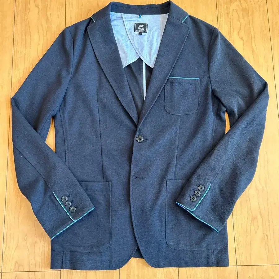네이비 캐주얼 자켓, 파란색 파이핑과 스트라이프 안감이 특징입니다.