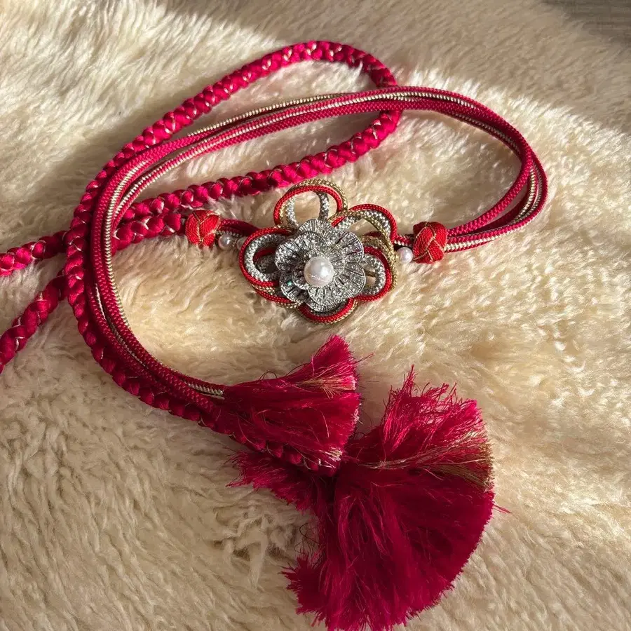 빨간색 합성섬유 오비 고정 띠, 펄과 꽃 모티브 장식 포함. 성인식 때 약 2시간 착용했던 제품입니다. 자택 보관 중고품에 이해가 있으신 분 잘 부탁드립니다. 내일 발송 가능합니다. - 색상: 빨간색 - 소재: 합성섬유, 금속 - 장식: 펄, 꽃 모티브 - 스타일: 전통적인 오비 고정 띠 - 태슬: 있음 방문해 주셔서 감사합니다.