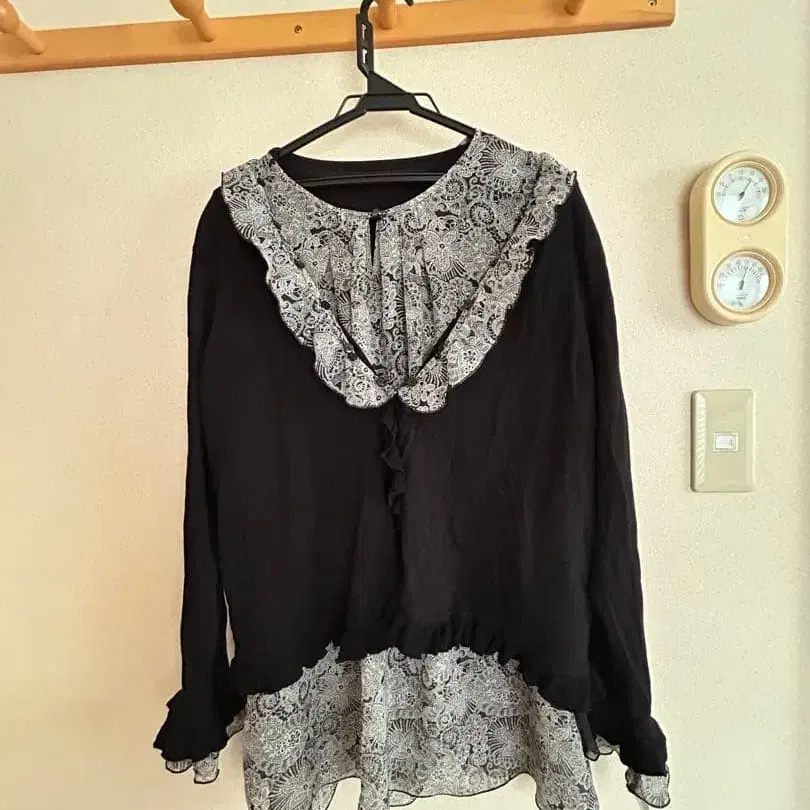 프릴과 레이스 디테일이 특징인 긴팔 셔츠.