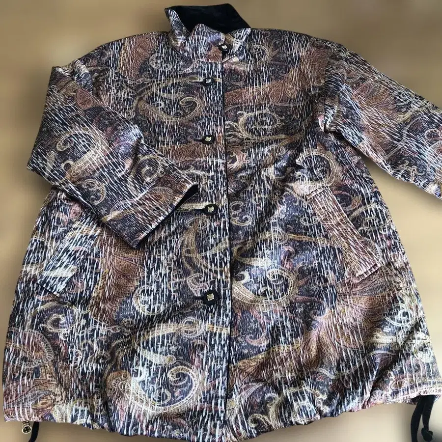추상적인 무늬의 후드 부착 롱 자켓, 골드 컬러 버튼이 특징. - 색상: 멀티 컬러 - 디자인: 추상적인 무늬 - 스타일: 롱 자켓 - 장식: 골드 컬러 버튼 - 특징: 후드 부착 방문해 주셔서 감사합니다. 사이즈 - L