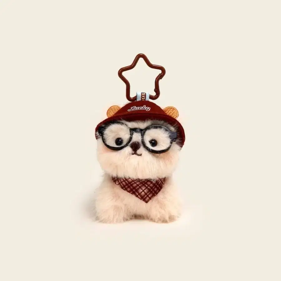 크림색 봉제 인형 마스코트, 안경과 반다나를 착용하고 있으며 별 모양 키링이 달려 있습니다. - 모델명: 봉제 인형 마스코트 - 색상: 크림색 - 특징: 안경과 반다나 착용 - 액세서리: 별 모양 키링 포함 방문해 주셔서 감사합니다.