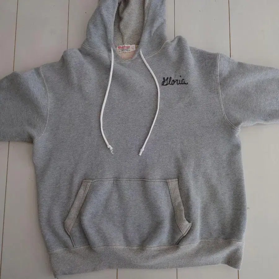그레이 색상의 후드 부착 후드티, Gloria 자수 포함.