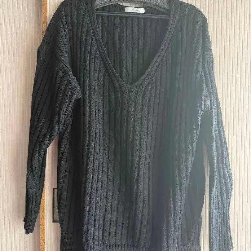 리브 편직의 V넥 디자인으로, 심플하면서도 세련된 인상을 주는 블랙 니트.