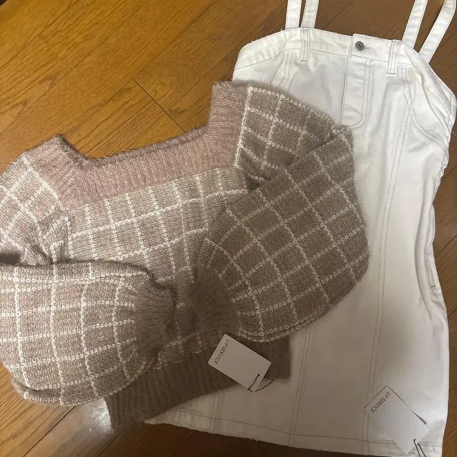 LIP SERVICE 브라운 니트탑과 화이트 데님 오버롤 스커트입니다. 사진 촬영을 위해 개봉했으며, 촬영 후 바로 봉투에 넣었습니다. 택 포함입니다. 즉시 구매 ⭕️ 색상 - 브라운 계열 계절 - 가을/겨울 얼룩, 찢김, 냄새 등 - 없음
