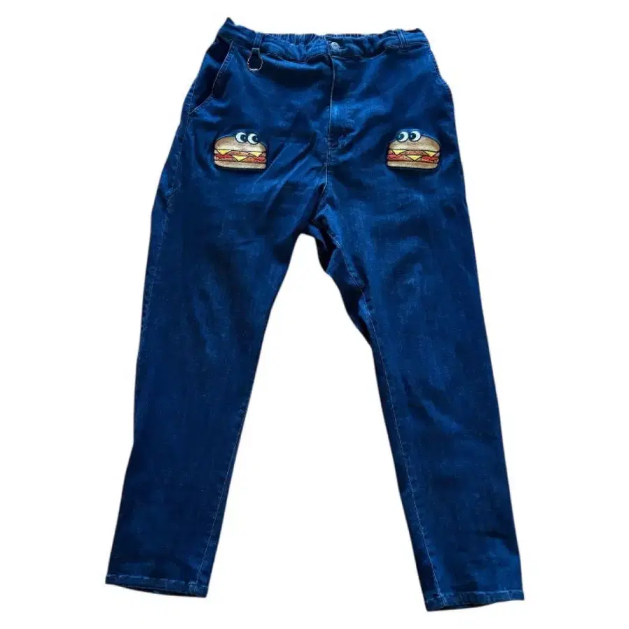 햄버거 자수 디자인이 특징인 허리밴딩 데님 팬츠. - 디자인: 햄버거 자수 - 허리: 허리밴딩 - 택: 빵군 택 방문해 주셔서 감사합니다.