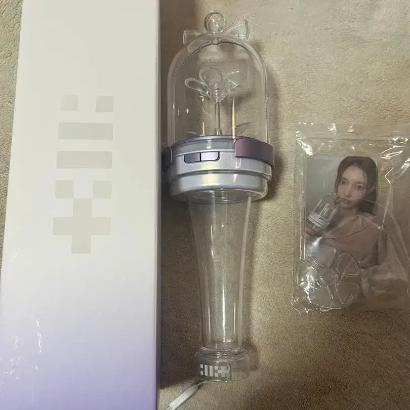 투명한 디자인의 응원봉으로, 보라색 악센트가 특징입니다. 혜택 카드가 포함되어 있습니다. - 모델명: 응원봉 - 색상: 투명, 보라색 - 부속품: 박스, 혜택 카드 라이브에서 한 번만 사용했습니다. 즉시 구매 가능합니다. 가격 인하는 불가합니다. 방문해 주셔서 감사합니다.