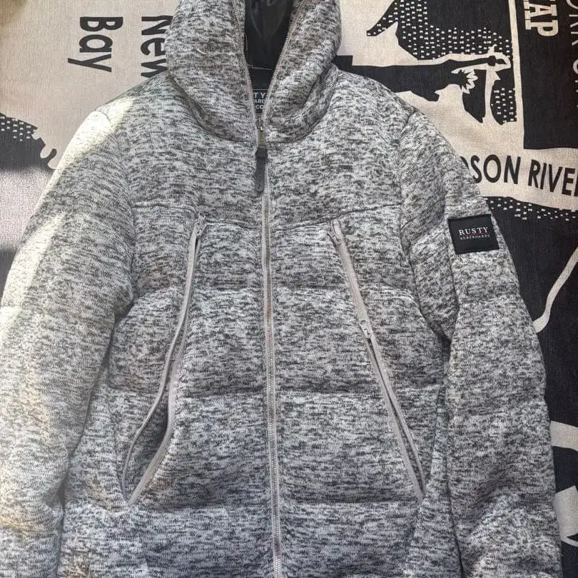 후드 부착 그레이 계열 다운 자켓, 부드러운 안쪽 소재로 쾌적한 착용감. - 브랜드: RUSTY - 색상: 그레이 계열 - 특징: 후드 부착, 지퍼 개폐 - 안쪽 소재: 부드러운 소재 - 디자인: 퀼팅 디자인 방문해 주셔서 감사합니다. 사이즈 - L