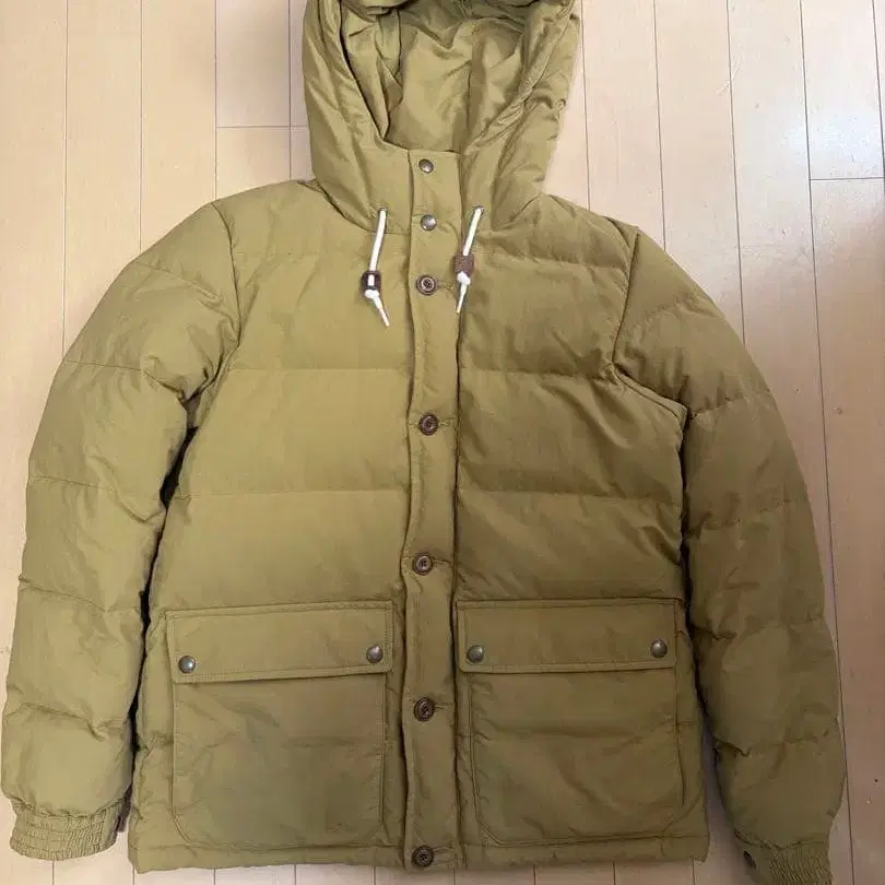 후드 부착 올리브 색상 다운 자켓, 단추식과 포켓 부착으로 기능적입니다.