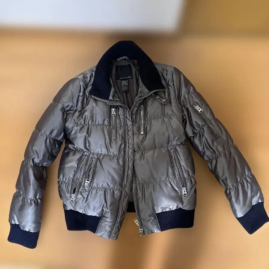 리브가 달린 옷깃과 소매를 가진 그레이 색상의 퀼팅 다운 자켓.