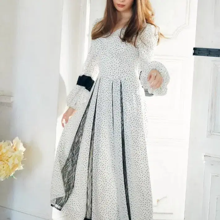 하립투 도트 무늬 레이스 롱 원피스 도트 플레어