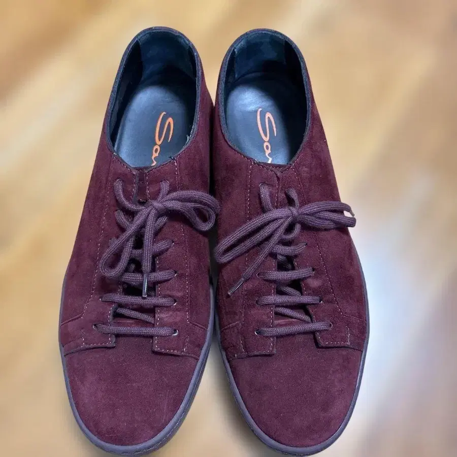 SANTONI 버건디 색상의 스웨이드 소재를 사용한 캐주얼 스니커즈 사이즈는 8하프 구매 후 미사용 상태로 자택 보관했습니다.