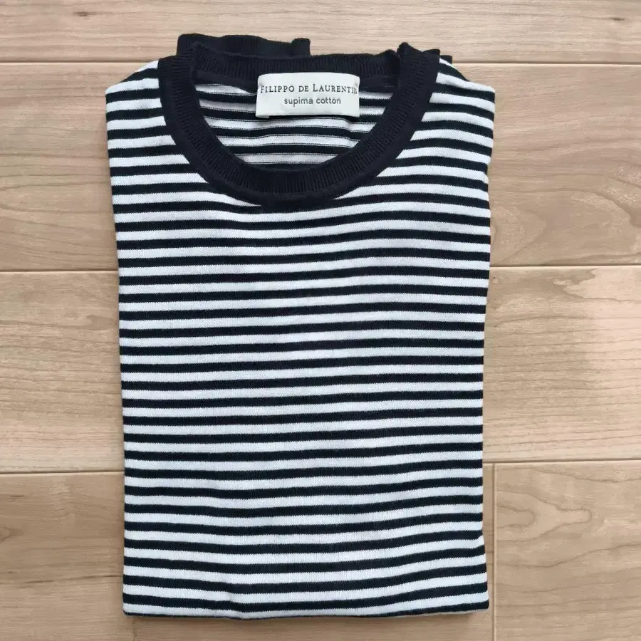봐주셔서 감사합니다. FILIPPO DE LAURENTIIS (필리포 데 로렌티스) 코튼 니트 T셔츠 화이트 블랙 보더 새상품 구매 후 몇 번 착용한 새상품급입니다. 사이즈 48 소매 길이 26 어깨 너비 36.5 기장 62 가슴 너비 50 ※ 약간의 오차는 양해 부탁드립니다. 잘 부탁드립니다.