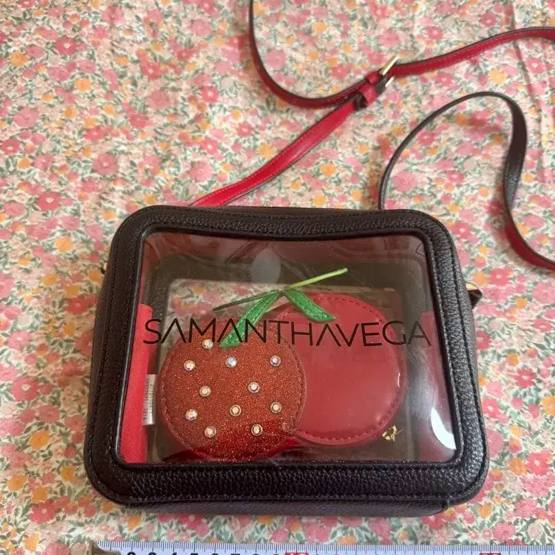투명 포켓이 달린 블랙 & 레드 숄더백. - 브랜드: SAMANTHAVEGA - 색상: 블랙/레드 - 디자인: 투명 포켓 부착 - 사이즈: 약 10cm x 15cm x 6cm - 소재: 합성 피혁 방문해 주셔서 감사합니다.