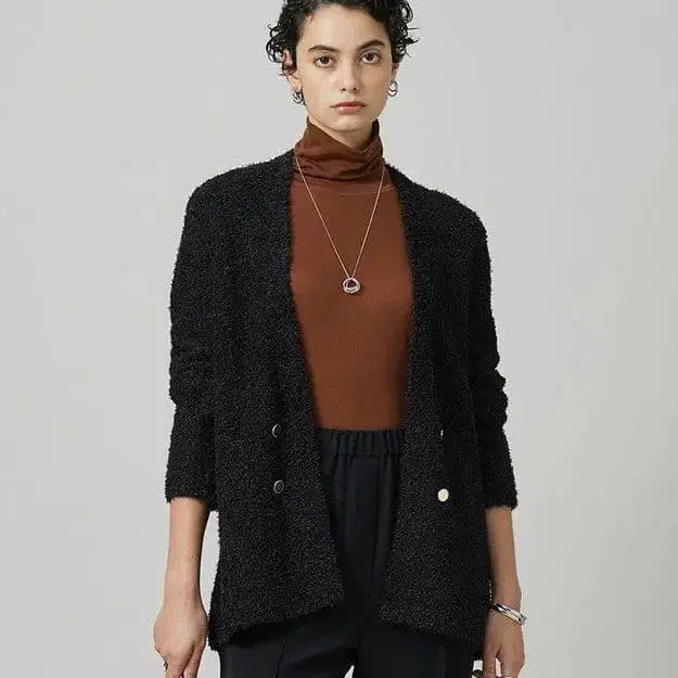 트위드처럼 풍부한 표면감이 매력적인 노카라 니트 자켓.