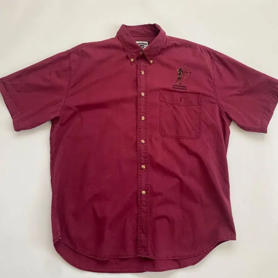 버건디 색상의 100% 코튼 반팔 셔츠, 아처리 자수 디자인 포함.