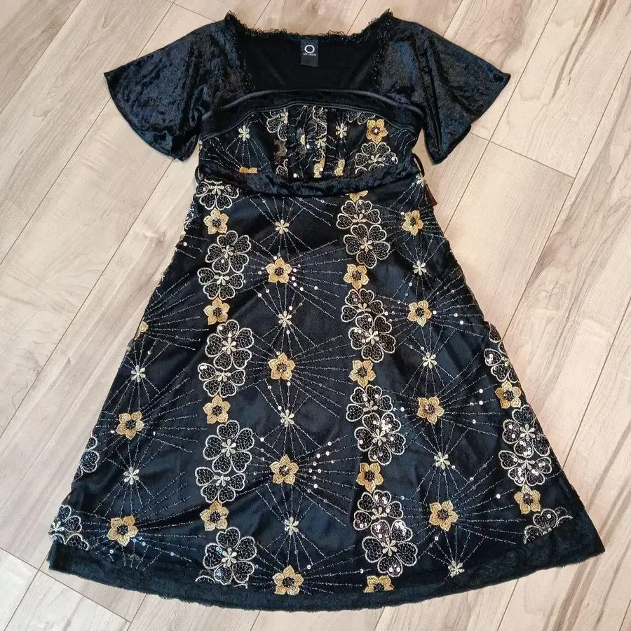 오즈 오네스트 블랙 베이스에 스팽글과 꽃무늬 자수가 들어간 반팔 무릎 기장 원피스. 일부 벨로아 소재 - 브랜드: OZZ ONESTE - 색상: 블랙 - 디자인: 스팽글 & 꽃무늬 자수 - 소매 스타일: 반팔 - 기장 스타일: 무릎 기장 - 사이즈: 표기 없음 (M 사이즈 정도) [ 실측 평평하게 놓음 ] - 기장: 95cm - 소매 길이: 23cm - 가슴 너비: 39cm - 밑단 폭: 83cm 약간의 오차는 용서해 주세요.